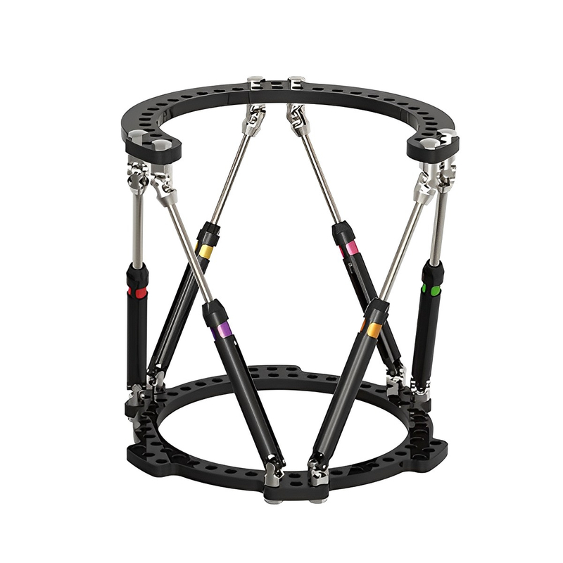 Le Taylor Spatial Frame est un fixateur externe annulaire moderne qui combine les principes du fixateur Ilizarov avec la technologie assistée par ordinateur.Il se compose de six entretoises réglables qui sont reliées à un anneau à chaque extrémité et peuvent être ajustées en trois dimensions pour corriger les déformations osseuses ou les écarts de longueur.Le Taylor Spatial Frame est particulièrement utile pour traiter les déformations complexes des os longs, telles que la courbure ou la torsion.