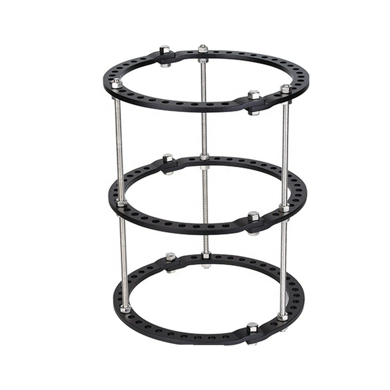 Un fixateur annulaire est un dispositif de fixation externe constitué d'anneaux métalliques reliés par des entretoises et des fils.Les anneaux sont attachés à l'os avec des fils qui traversent la peau et les muscles.Les fils sont tendus pour comprimer les fragments d'os et les maintenir en position.Les entretoises sont utilisées pour ajuster l'alignement et la longueur de l'os, ainsi que pour assurer la stabilité et le soutien.Le fixateur est généralement porté pendant plusieurs semaines ou mois jusqu'à ce que l'os guérisse.