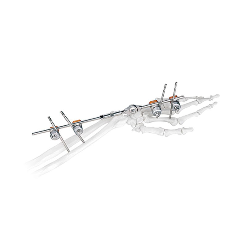 Un fixateur externe d'articulation du poignet est un dispositif utilisé pour stabiliser l'articulation du poignet pendant le processus de guérison suite à une blessure ou à une intervention chirurgicale.Il est couramment utilisé dans les cas de fractures complexes, de luxations ou de lésions ligamentaires de l'articulation du poignet.Le fixateur externe est placé à l'extérieur de la peau et est attaché aux os à l'aide de broches ou de fils, qui sont insérés à travers la peau dans l'os.