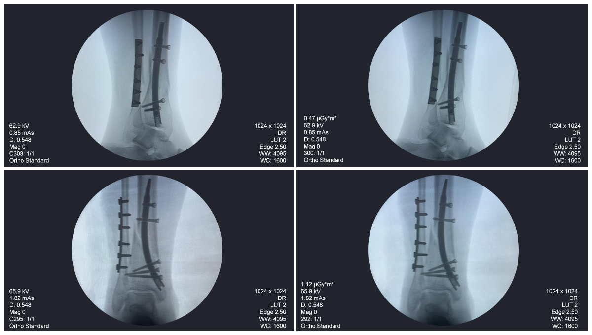 Ce cas concernait une fixation tibiale distale à l’aide d’un clou tibial distal intramédullaire. La radioscopie peropératoire a confirmé la position du clou, des vis de verrouillage distales et de la fixation par plaque fibulaire.